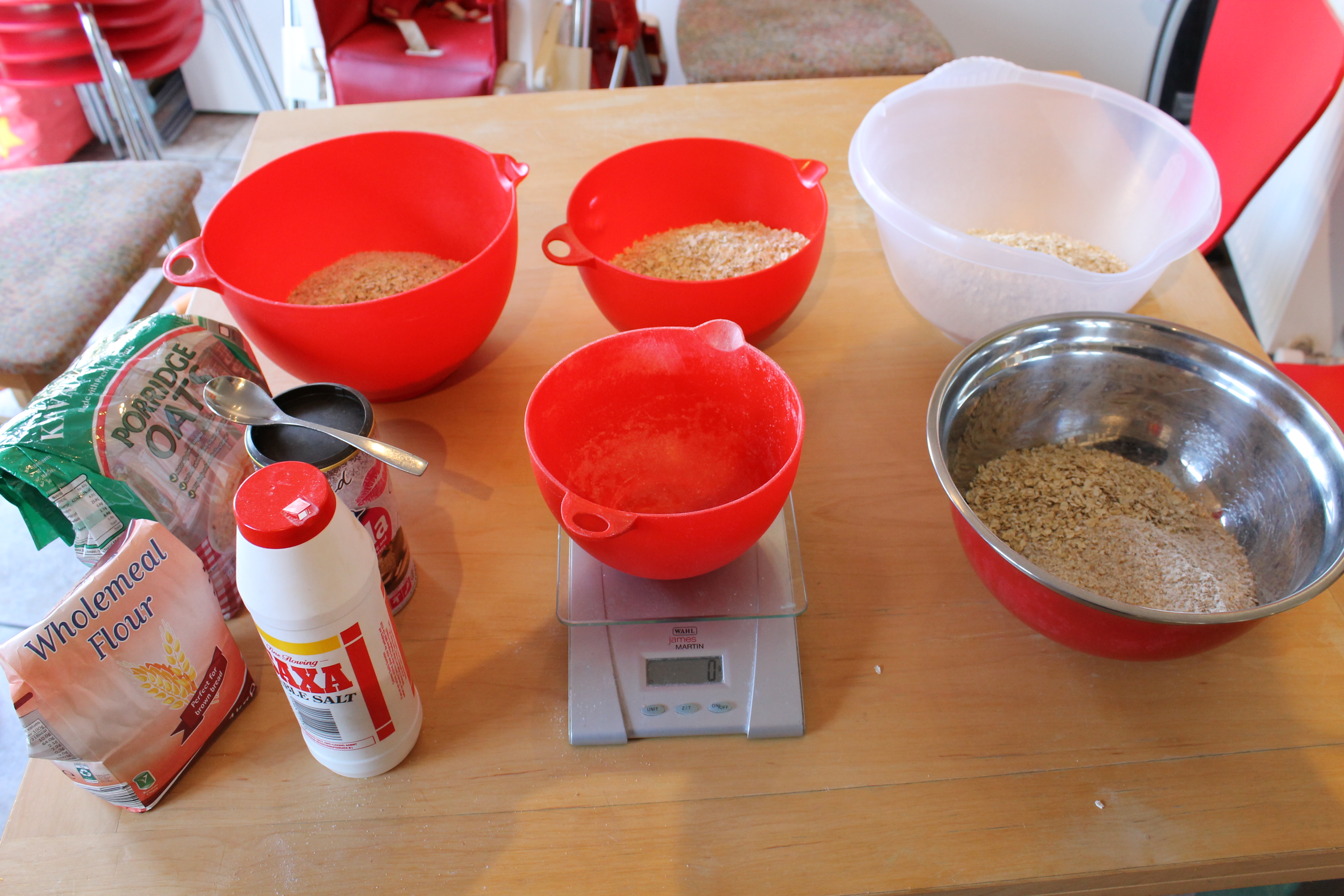 It is very easy. I make batches of the dry ingredients, where I weigh them all out and bag them up. And because I’m keeping it all wholemeal, I don’t add the 50g plain flour, I just use 400g wholemeal flour. Dry ingredients are 400g wholemeal flour, 50g porridge oats, 2 level teaspoons of bicarbonate of soda and a pinch of salt.