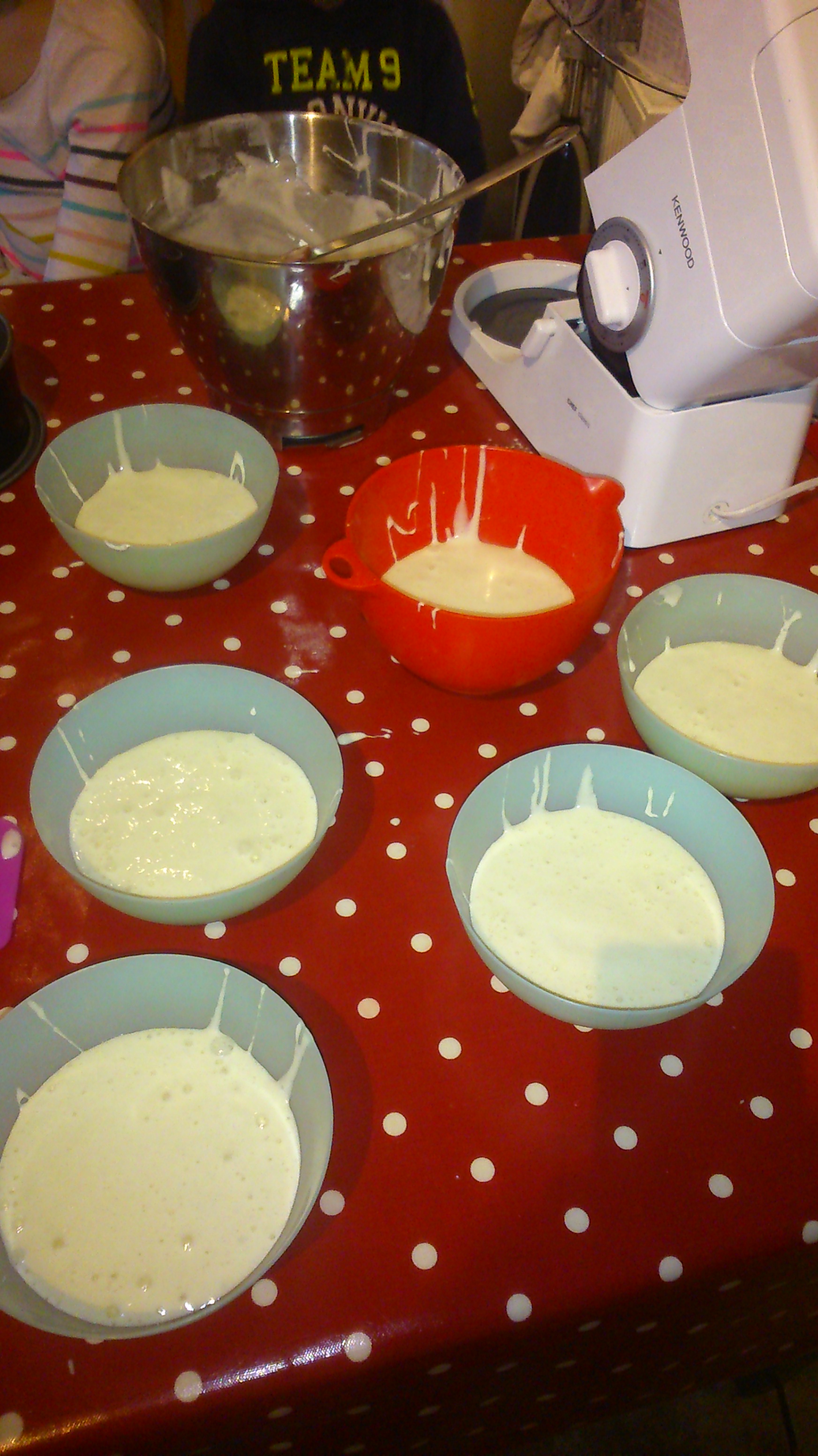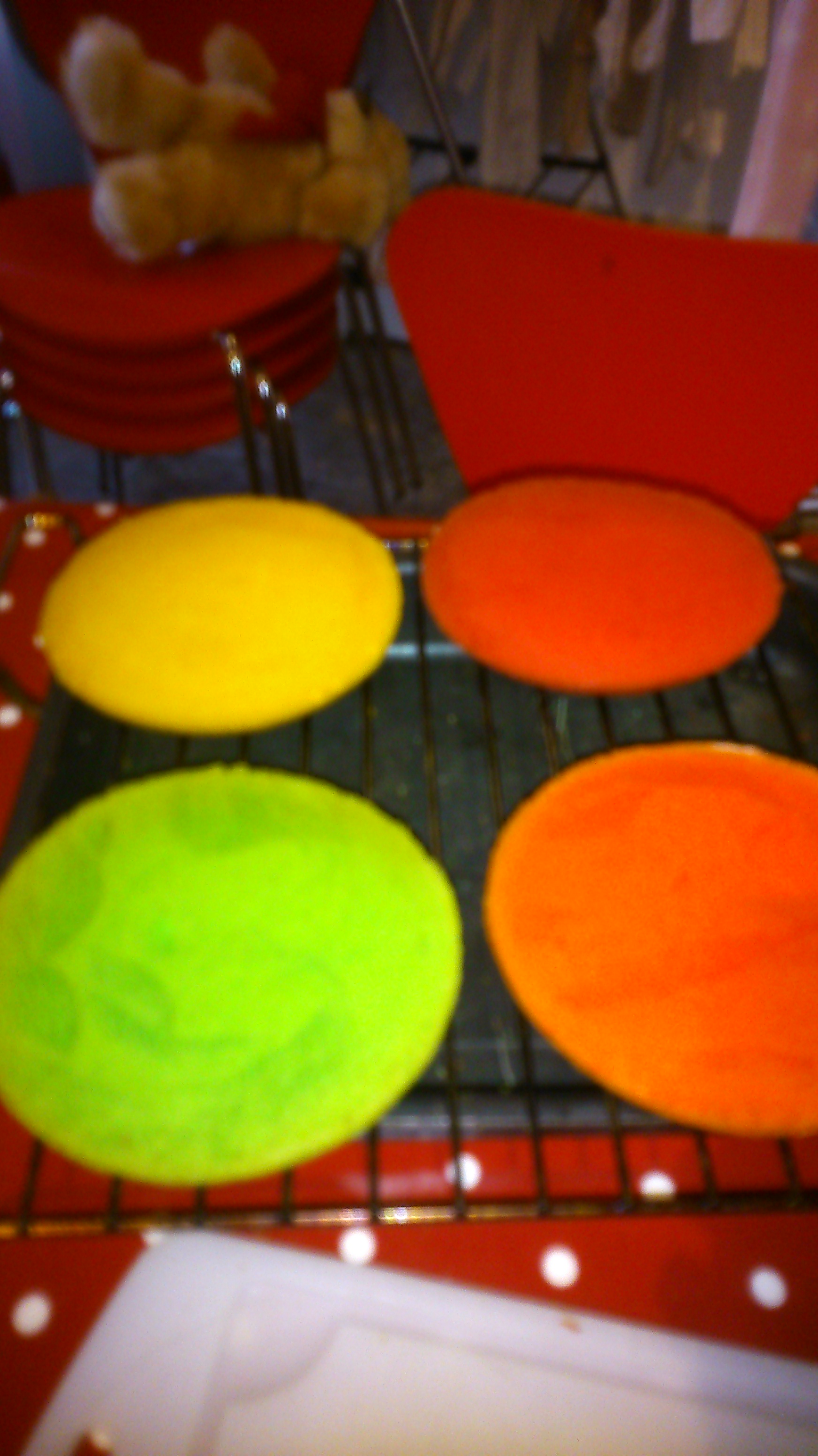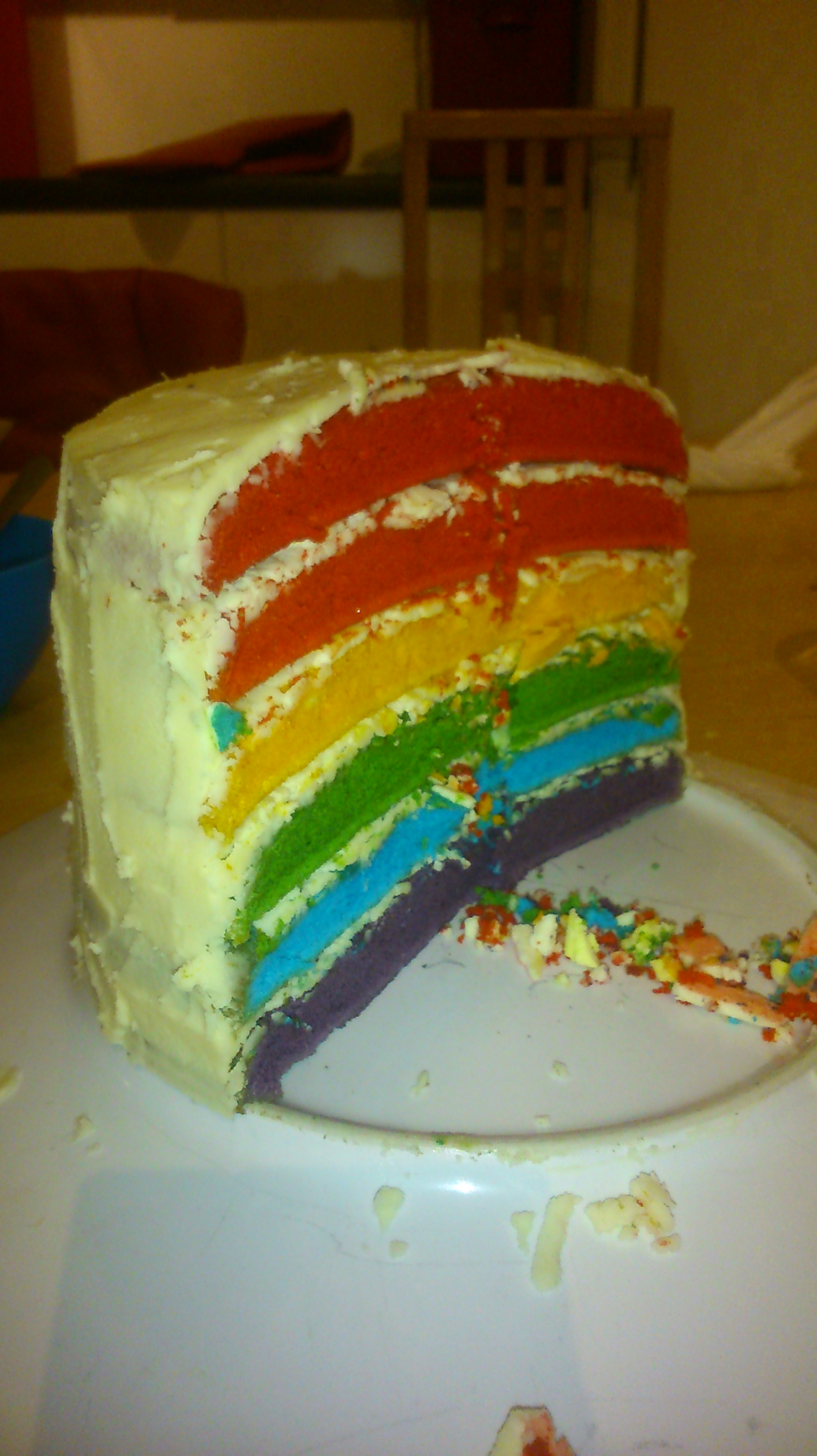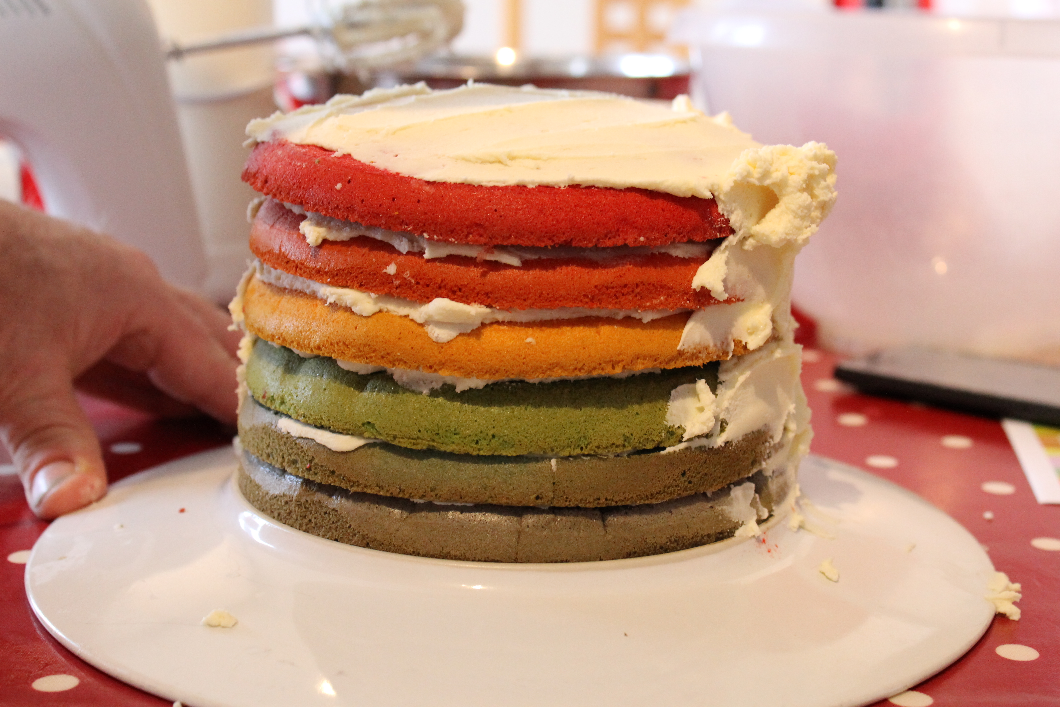 A friend, who had a cake business, told me the key to good colours was to use a yolk free batter, so I found a recipe for an angel food cake. The recipe I used had 12 egg whites, and you beat them to nice and puffy – but of course once you split it between six bowls (it loses a bit of air, and “puff”) and then mix in the food colour gels, it had lost all its air and all its puff. Which I think then affected the texture and taste.