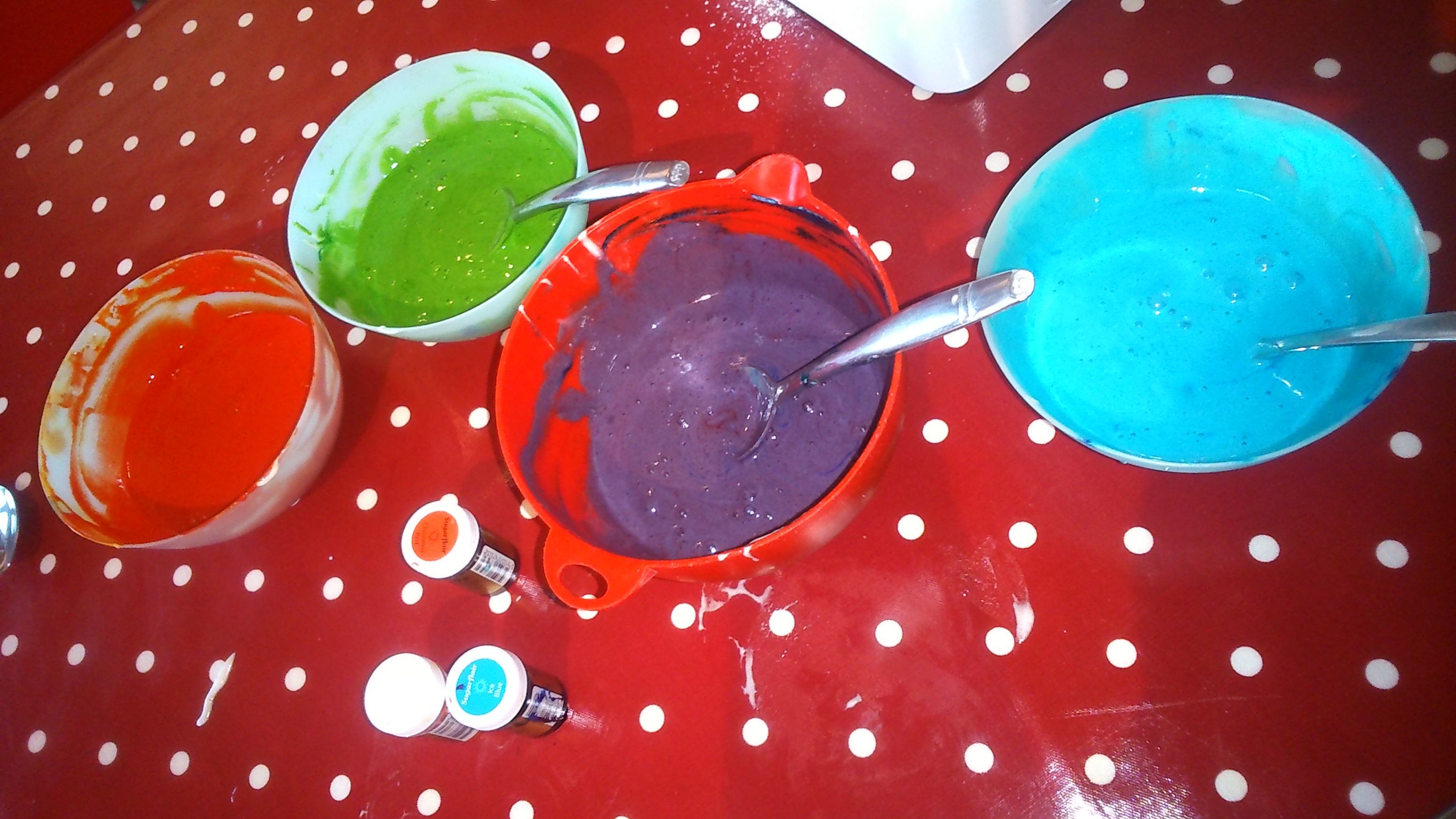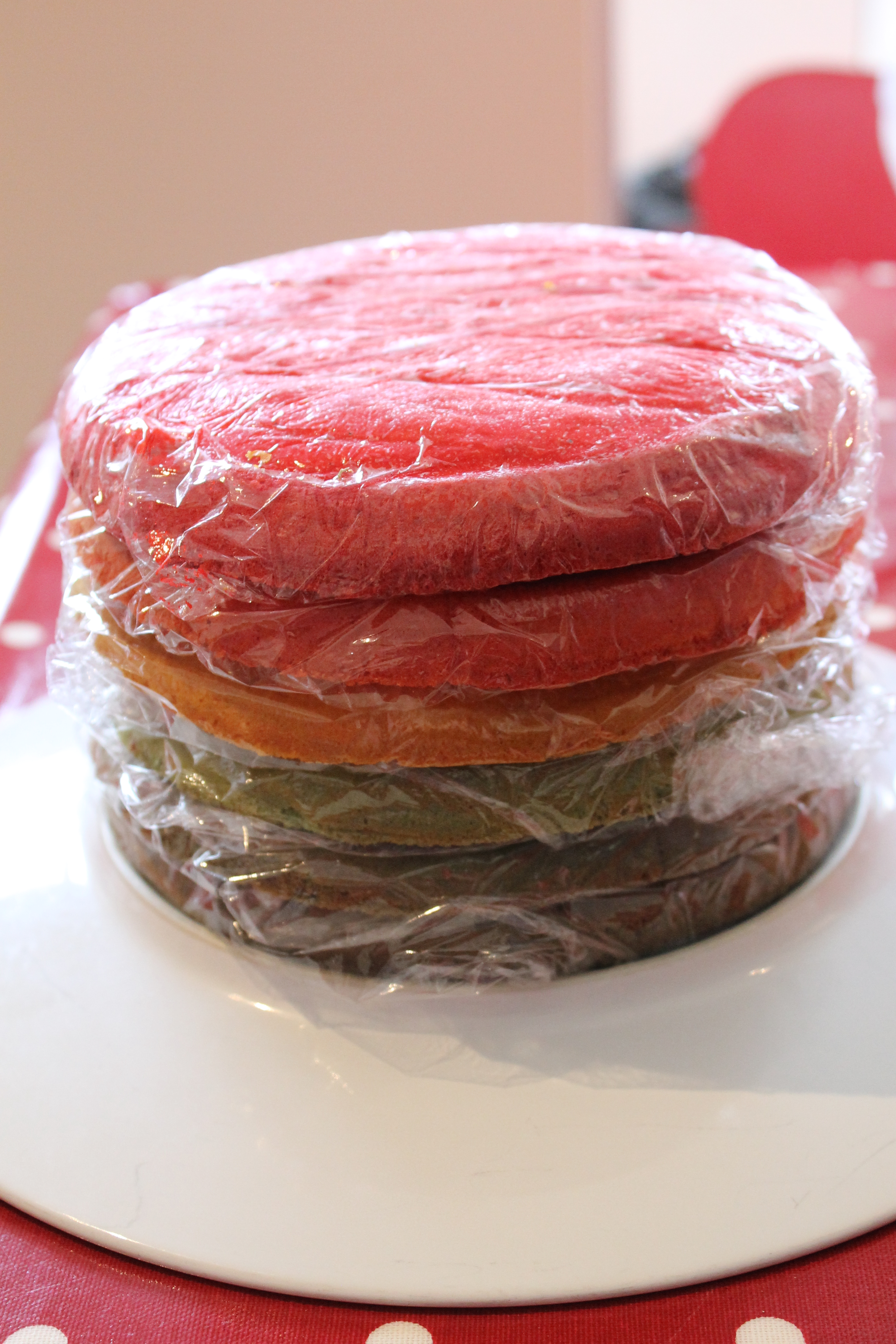 I had a bit of an issue with my orange layer. I decided to work through the rainbow starting at red, then orange. I put in equal amounts of red and yellow food gel to make the orange, not realising that the red dye was extremely strong. I ended up having to put about half the jar of yellow food gel into it, and still in the bowl it looked red. It didn’t look at bad once it actually baked.