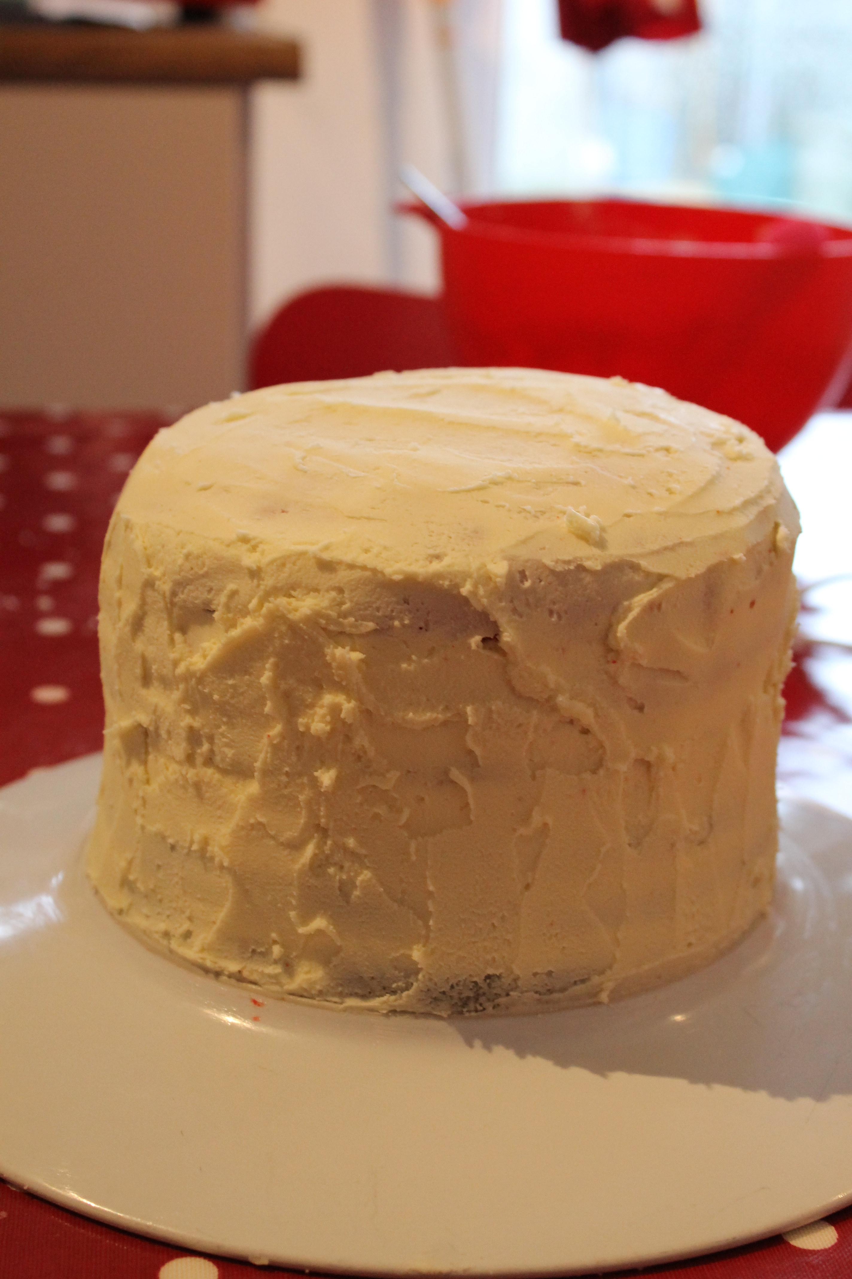 Next morning I made a lovely white chocolate buttercream icing (that I found the recipe of here: http://allrecipes.co.uk/recipe/16140/white-chocolate-buttercream-icing.aspx) and added a layer in between and on top. The fun began when I tried to do the sides. I just didn’t have the patience, it kept falling off.